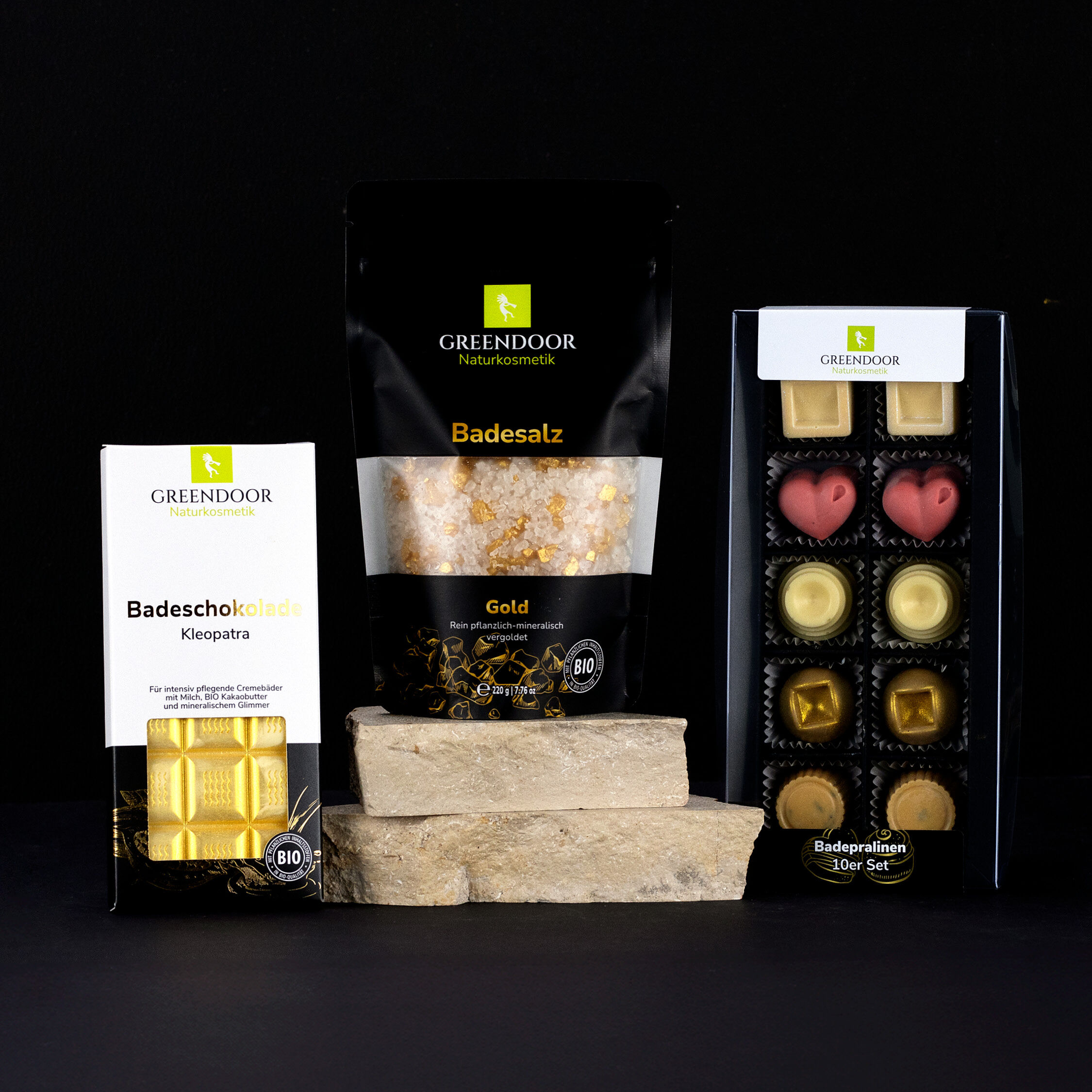 Die GREENDOOR Badezusätze bieten intensive Pflege und Entspannung: Die Badeschokolade Kleopatra nährt trockene Haut mit Milch und Bio-Kakaobutter, während das Badesalz GOLD mit feinstem Meersalz und ätherischen Ölen für puren Luxus sorgt, ergänzt durch pflegende Badepralinen im Geschenkset. Erhalte jetzt auf alle Badezusätze 15% Rabatt** auf deinen Einkauf ab 25€ mit dem Code "BLACK-15".