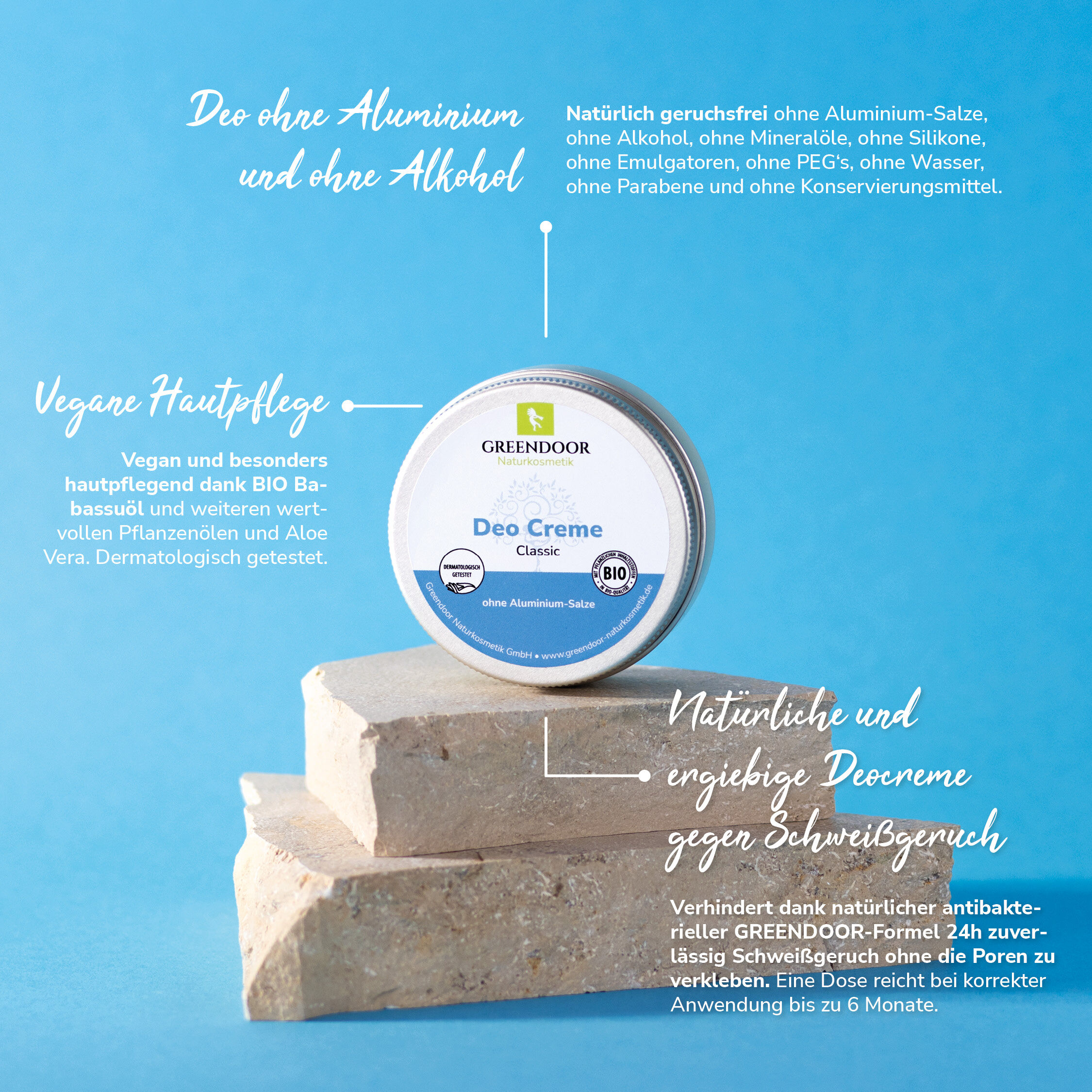 Brennt nicht, reizt nicht, zarter dezenter unisex Duft - ideales Deo für Männer und Deo für Frauen. Natürliches Creme Deo ohne Aluminium-Salze, ohne Alkohol, ohne Mineralöle, ohne Silikone, ohne Emulgatoren, ohne PEG's, ohne Wasser, ohne Parabene und sogar ganz ohne Konservierungsmittel. Veganes Deo. Schon gewusst? GREENDOOR steht auf der Positivliste von Peta e.V.