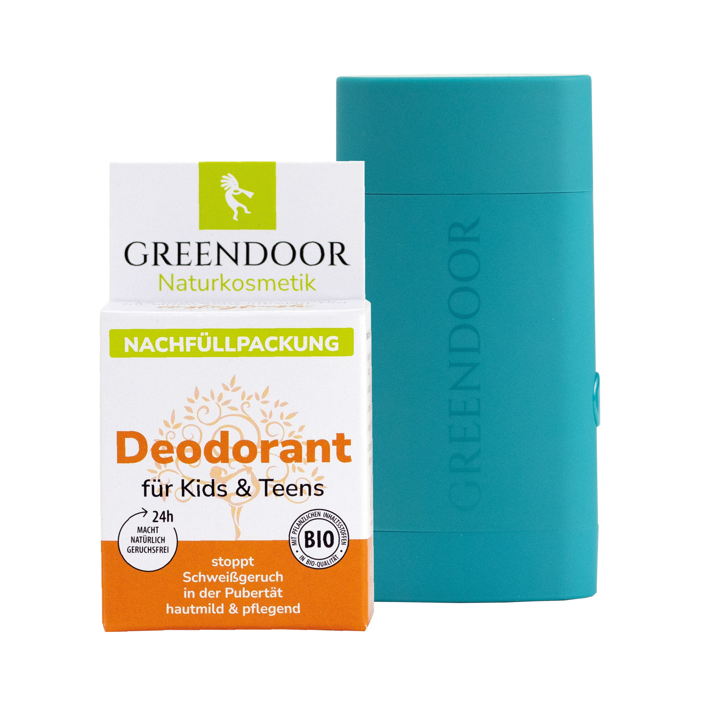Du erhältst: 1 Nachfüller Deodorant Kids & Teens und 1 leere GREENDOOR Deodorant System Hülse in der Farbe Petrol.