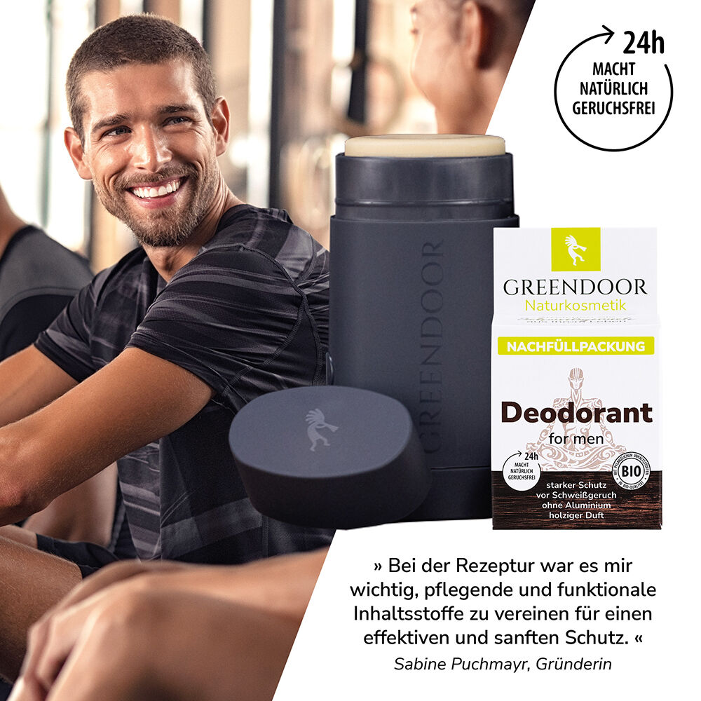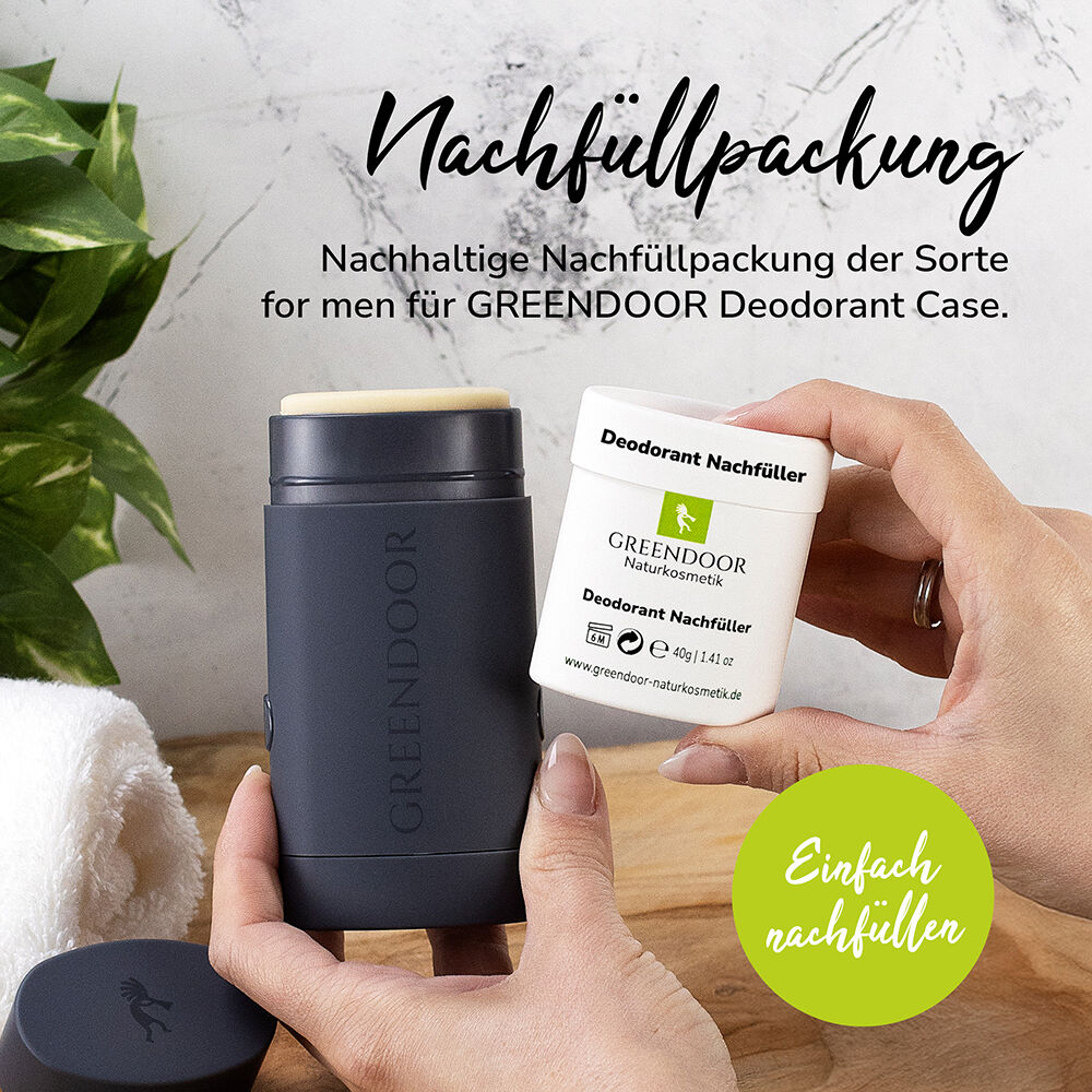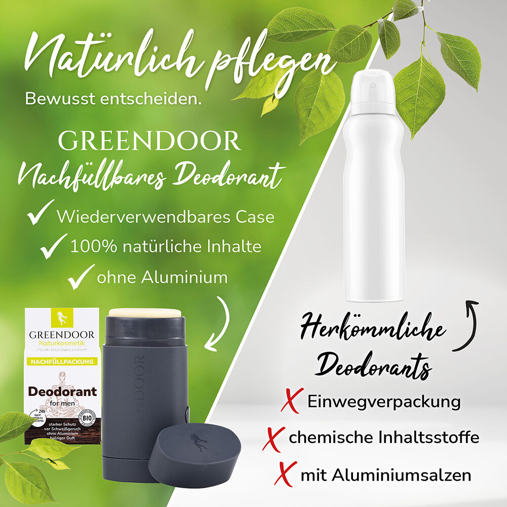 Sie erhalten: 1 Nachfüller Deodorant for men (funktioniert nur mit einem bereits vorhandenen GREENDOOR Deodorant Nachfüllsystem)