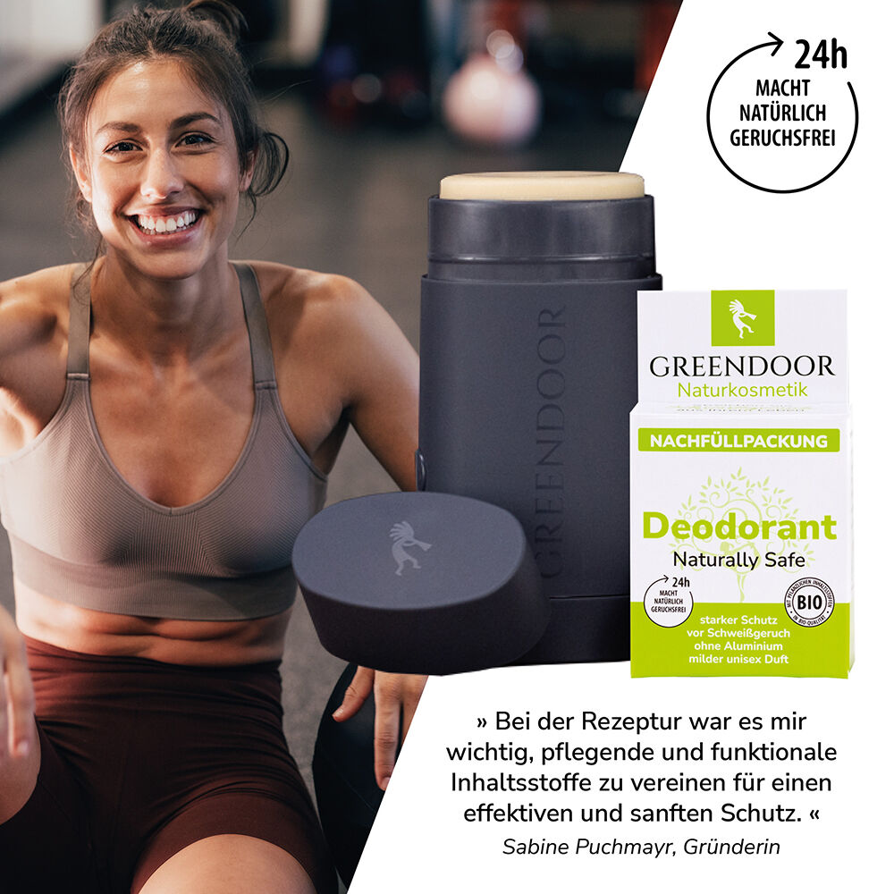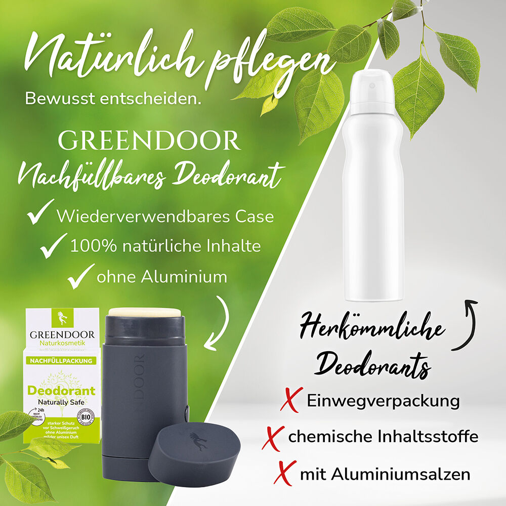 Streiche Schweißgeruch aus deinem Leben – mit dem GREENDOOR Deodorant Nachfüllsystem. Das innovative hoch wirksame Deodorant System mit 24h+ Schweißgeruch-Freiheit setzt neue Maßstäbe in der nachhaltigen und aluminiumfreien Körperpflege.