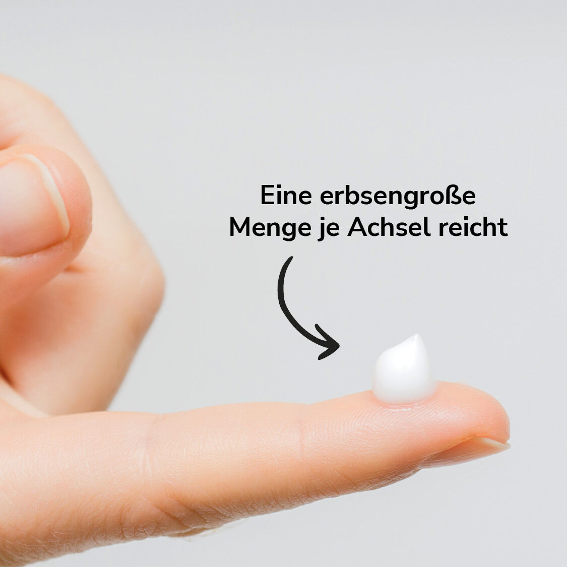 Application: Apply ideally to freshly washed underarm skin. Take a pea-sized amount from the tube with your fingertip and massage it into the underarm area in circular motions. With the correct amount, the packaging lasts 3–5 months.