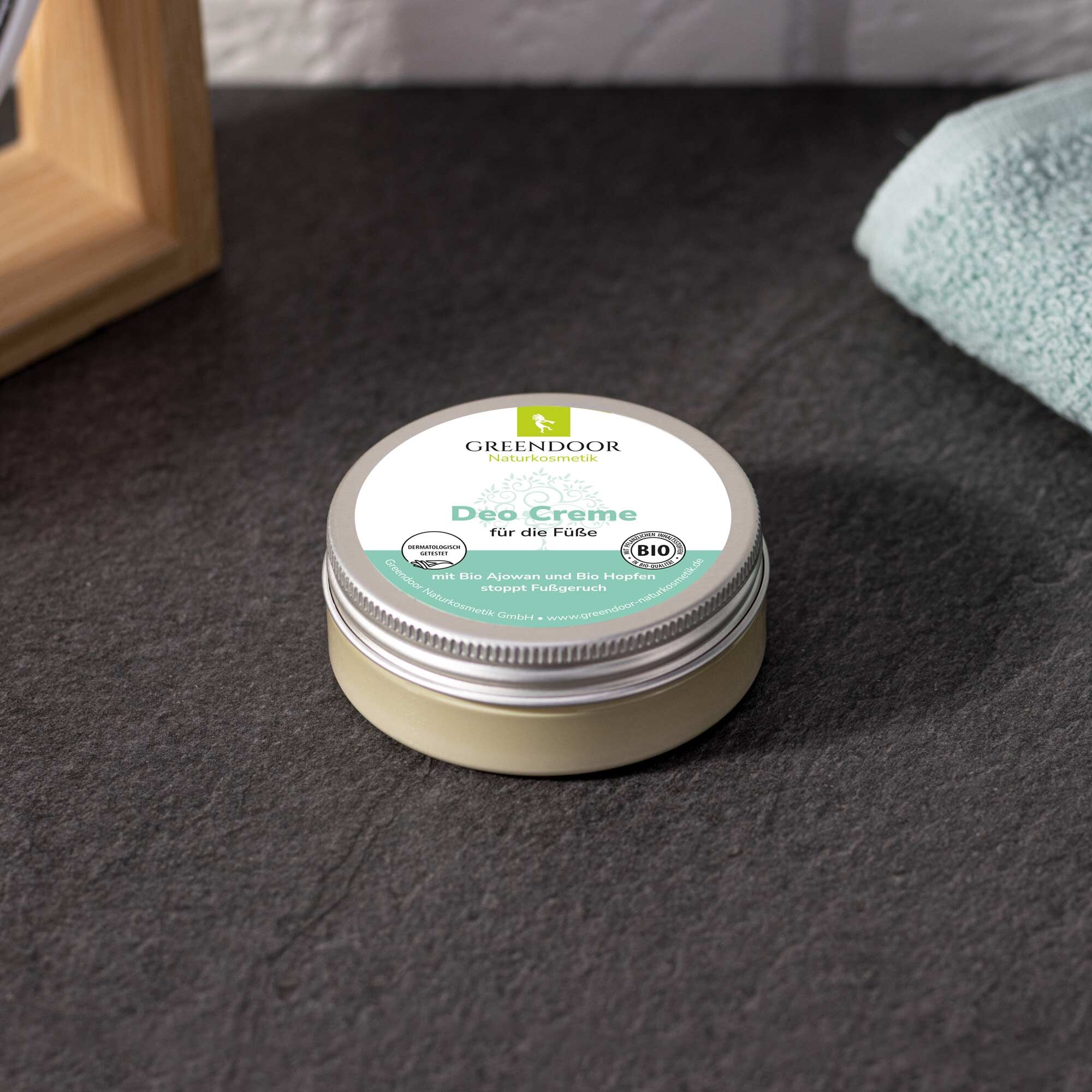 Die Fuß Deo Creme von GREENDOOR schützt dich vor unangenehmem Fußgeruch. Die Alpha- und Beta Säuren von Bio Ajovan Früchten und Hopfen enthalten antiseptische Kräfte und beugen unangenehmer Geruchsbildung bei der Schweißzersetzung vor. Echter Salbei (Salvia Officinalis) mit seiner adstringierenden Wirkung hemmt überschießende Schweißproduktion. Die Formulierung aus Bio Ölen, Aloe Vera und Kieselerde pflegt die beanspruchte Haut deiner Füße, der reine ätherische Duftkomplex spendet Frische und vitalisiert.