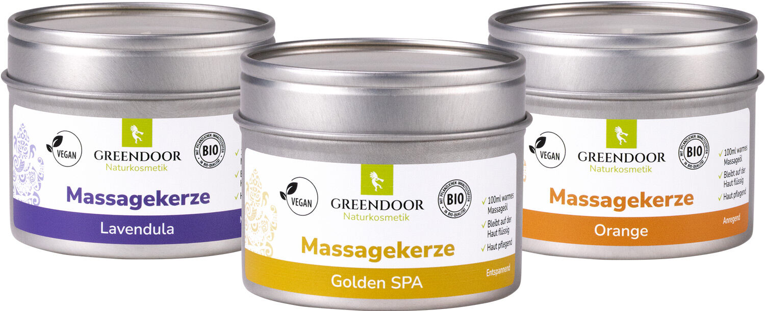 Eine Massagekerze ist Massageöl in fester Form. Der Docht erhitzt das Wachs genau so, dass es in geschmolzener Form in passender Temperatur vorliegt - zumindest bei GREENDOOR. Denn nur die richtige Mischung von Pflanzenwachsen und Ölen funktioniert perfekt. Dazu gehört auch, dass das flüssige Massagewachs auf der Haut nicht wieder fest werden kann. Magie? Nein, Physik.