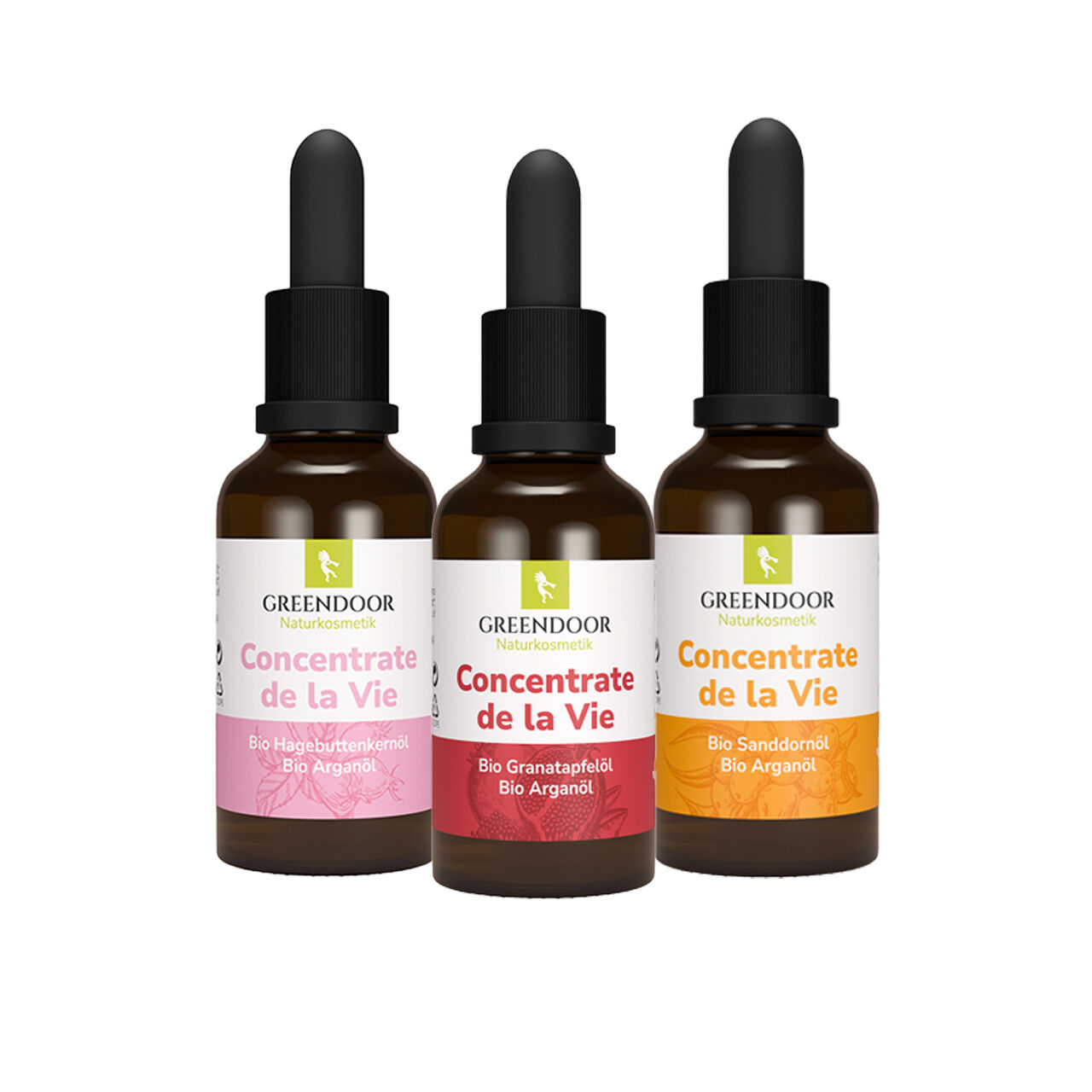 Nur die beste Basis zur Lösung der biologischen Konzentrate sorgt am Ende für das bestmögliche Ergebnis: GREENDOOR Bio Arganöl. GREENDOOR Bio Argan Öl aus ungerösteten Arganmandeln jeweils kombiniert mit Bio Hagebutte, Bio Sanddorn und Bio Granatapfelsamenextrakt versorgen Ihre Haut optimal mit Vitaminen, ungesättigten Fettsäuren, Carotinoiden und natürlichen Antioxidantien. Wir empfehlen GREENDOOR Concentrate bei reiferer Haut ab 40 zur Unterstützung der Zellregeneration und Vorbeugung von Falten, sowie zur unterstützenden Hautpflege bei Neurodermitis, Ekzemen und unreiner Haut.