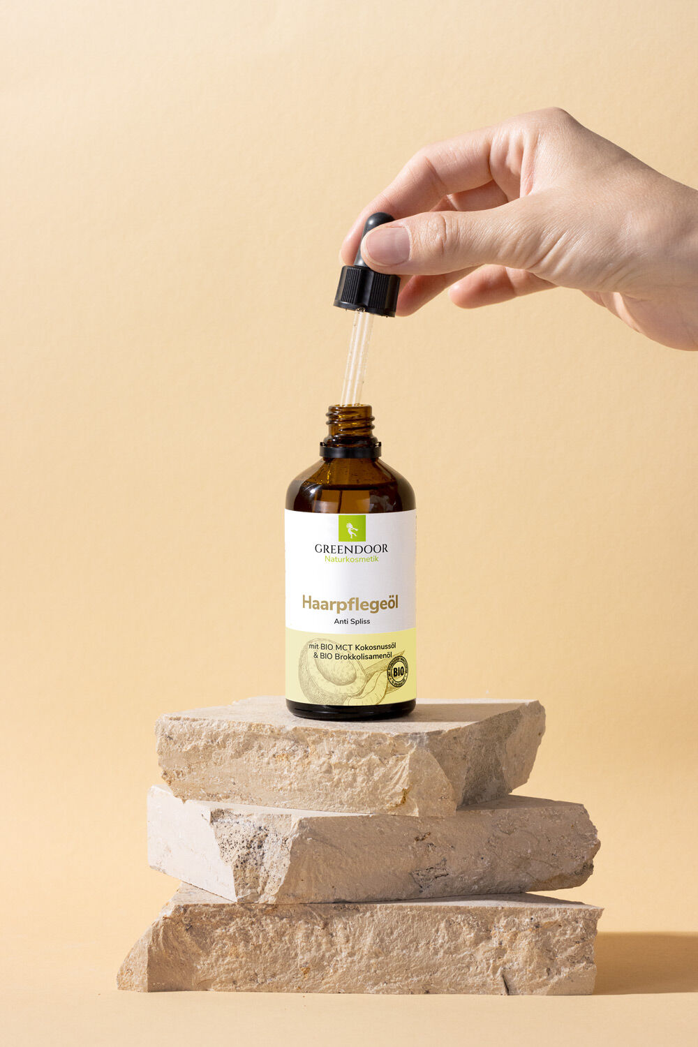 Das Haarpflegöl von GREENDOOR in der neuen 100ml Braunglasflasche mit Glaspipette ist eine Komposition aus wertvollem BIO-Kokosöl mit weiteren BIO-Ölen, die Ihr Haar pflegen aber dabei nicht beschweren. BIO Kokosöl, BIO Brokkolisamenöl und Sojaöl geben Ihrem Haar Glanz und Geschmeidigkeit, Aloevera spendet zusätzlich Feuchtigkeit. Pflanzliches BIO Glycerin, Lecithin und Panthenol bilden einen Repairkomplex, der angegriffene Haarspitzen pflegt und glättet.