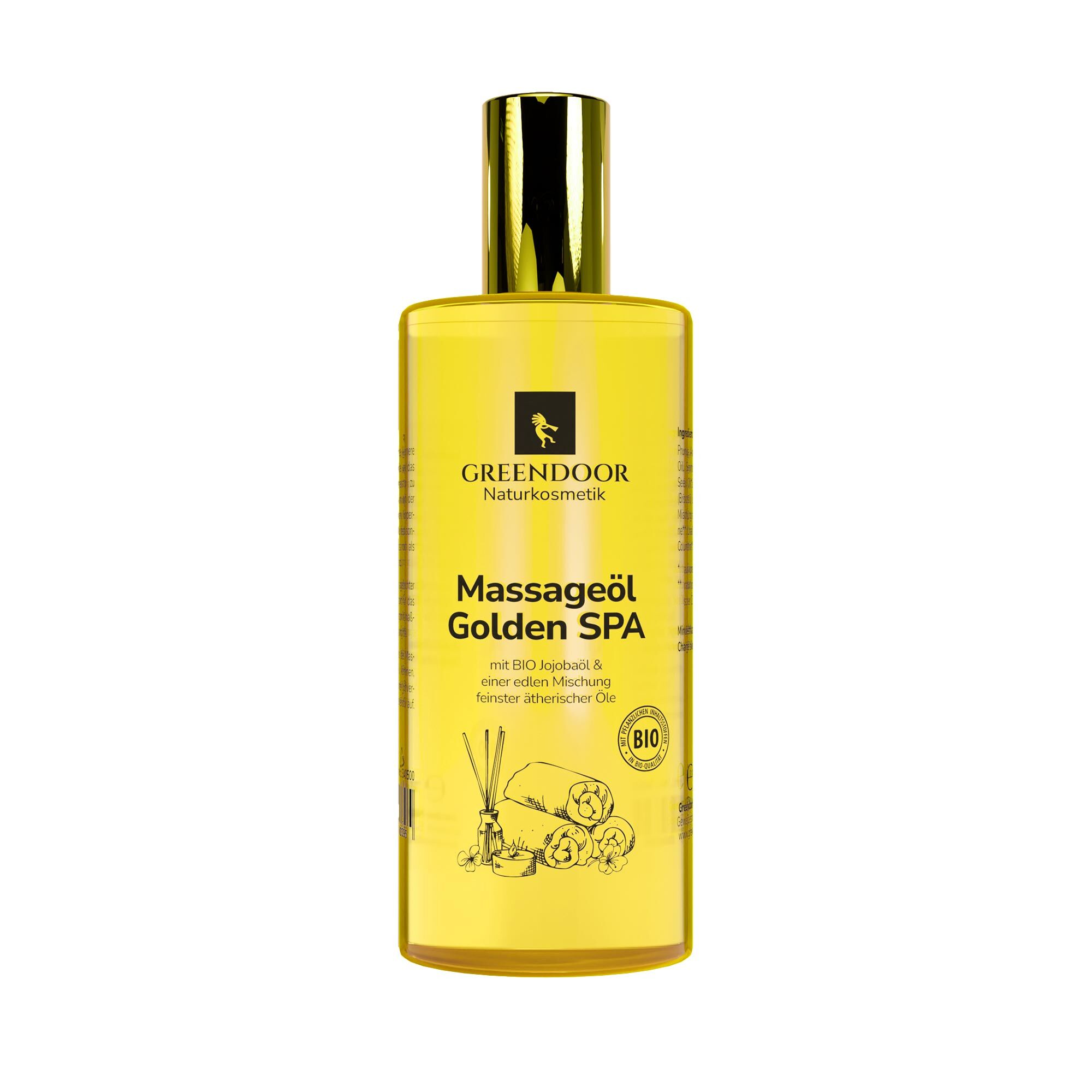 GREENDOOR Massageöl Golden SPA - das elegante Massageöl der besten Massagetempel Asiens. Zu 100% natürlich - ohne Paraffin, ohne Zusatzstoffe, ohne synthetische Düfte. Edles BIO Jojobaöl kombiniert mit zartem Aprikosenkernöl und BIO Brokkolisamenöl sowie einer Mischung verschiedener geheimnisvoller reiner ätherischer Öle ergibt dieses wundervolle edle GREENDOOR Massageöl.