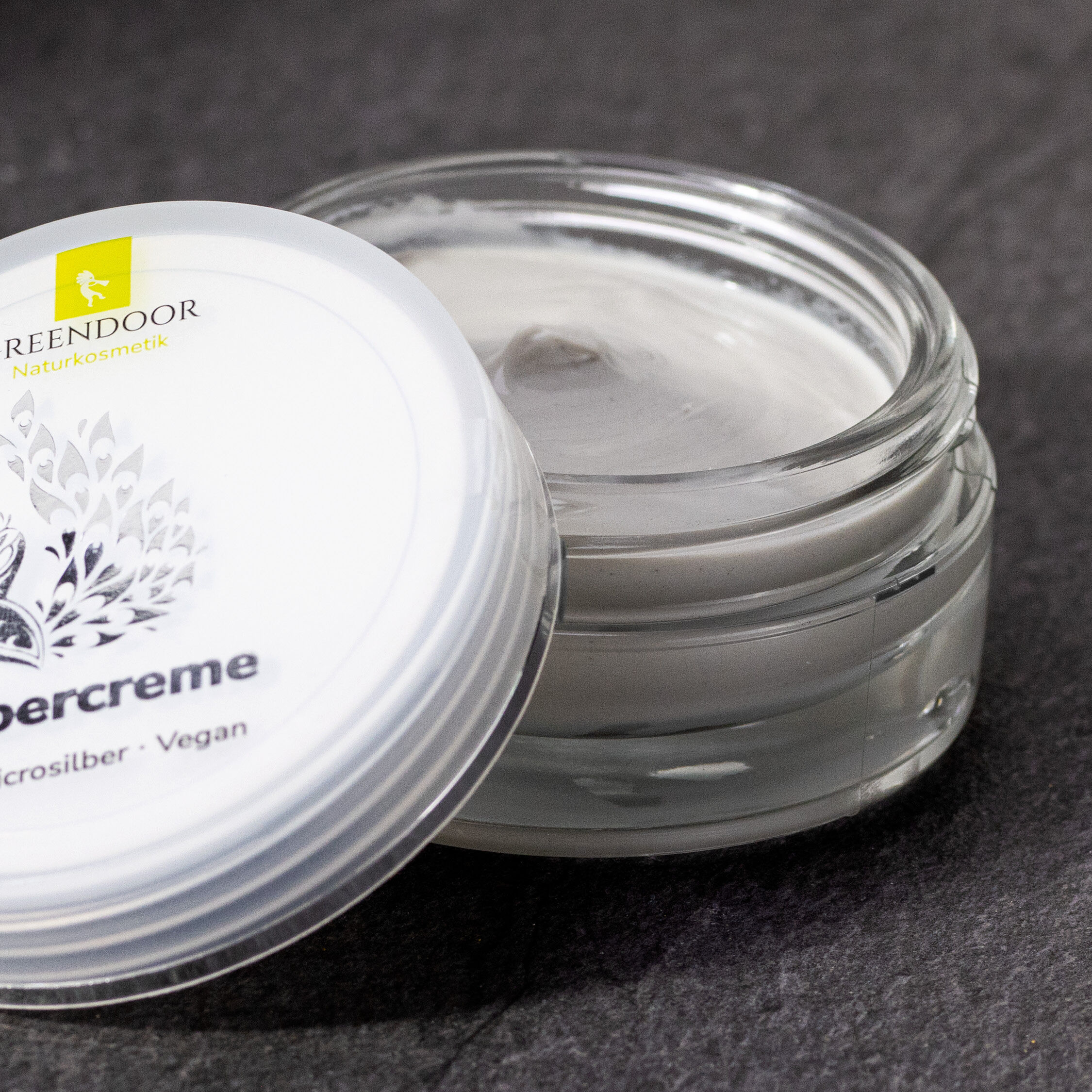 Unsere Silbercreme ist die natürliche Antwort auf Hautirritationen. Das enthaltene Microsilber entfaltet dank seiner Partikelgröße nur auf der Hautoberfläche seine Wirkung. Silber schützt nachweislich gegen eine Bandbreite verschiedenster Keime, Bakterien und Pilze und kann so Entzündungen, Rötungen und Hautirritationen entgegen wirken. Schon seit dem Mittelalter ist die antimikrobielle Wirkung von Silber bekannt und wird auch heute noch in der Wundversorgung eingesetzt. Die Formel der Silbercreme kombiniert Microsilber mit Bio Hamamelis, Ginseng, Ballonrebe, schwarzem Johanniskernöl und Hyaluronsäure, die die Haut regenerieren und intensiv mit Feuchtigkeit versorgen. Frei von Nanorohstoffen, Silikonen, Mineralölen, PEG, Parabenen und Mikroplastik.
