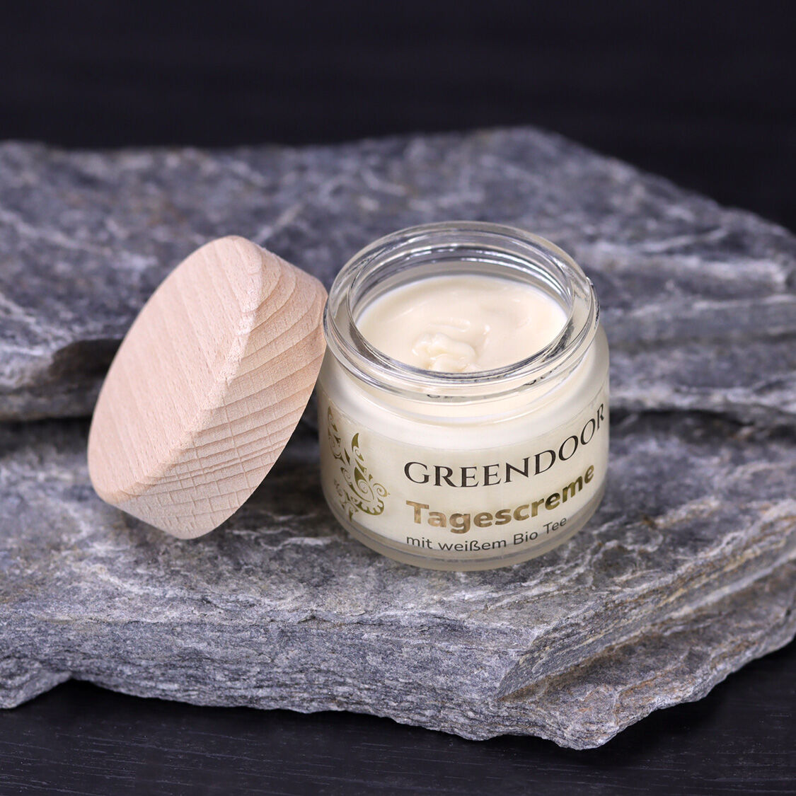 GREENDOOR vegane Tagescreme mit weißem Bio Tee schützt und strafft deine Haut und spendet ihr nachhaltig natürliche Feuchtigkeit. Sie schützt vor vorzeitiger Hautalterung - Angriffe freier Radikale, ausgelöst durch UV-Strahlung und Umweltverschmutzung, werden abgewehrt. Die Zellen sind geschützt, die Haut kann sich in Ruhe erneuern und reparieren.